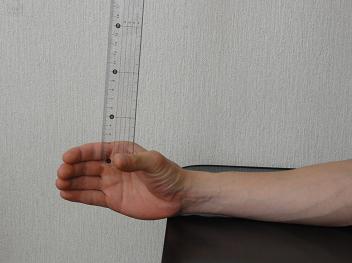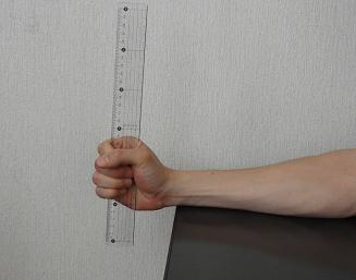 2)定規の最下端が、親指と人差し指の間で、