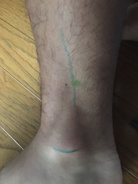 場所は、すねの骨(縦の青線)の側で内くるぶしの一番出っ張っているところに小指、薬指、中指、人差し指の順に足首を掴むように置きます。