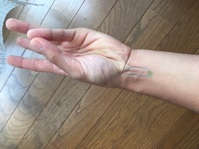 そして、三本置いた指の一番肘に近い指のきわで、先ほど出した二本のすじの真ん中にあるのが内関となります!(緑の点)