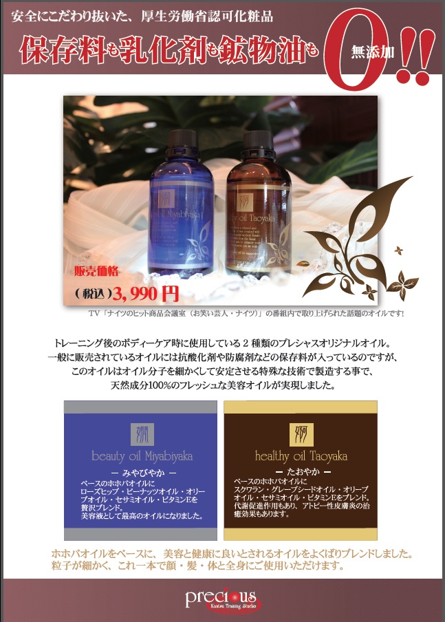 プレシャスのオイルは天然成分100%!!保存料、乳化剤、鉱物油ゼロです!!