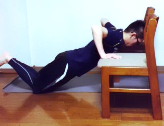 ・上体を背もたれの方向に倒し、両脚を伸ばして床から足を浮かした状態にする
