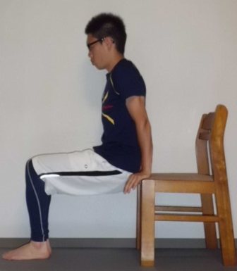 ・足を肩幅に広げ、椅子の前に立つ