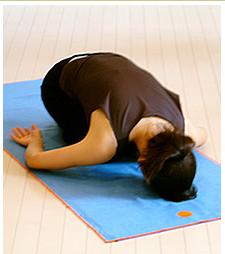 ■身体が硬く、上半身が宙に浮いてしまう方は、両手の拳を重ねてその上に額をのせてみしょう。