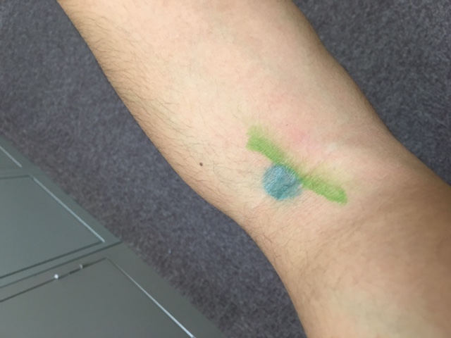 場所は肘周りにあり、肘のシワの上で腕を曲げた時に出る腱(緑線)の外側に取ります。