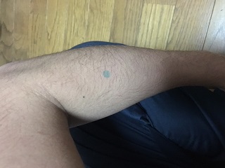 場所は肘を曲げた時にできるシワの一番外側から指を3本置いたところで拳を握ると筋肉が盛り上がるところに取ります(青点)。